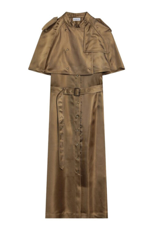 Beige water-repellent cotton gabardine long trench coat by Chloé, featuring a double-breasted front button closure, leather strap collar, adjustable and removable belt, two front flap pockets with button, long sleeves with adjustable cuffs, epaulettes on the shoulders, and a fluid fit.