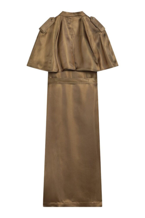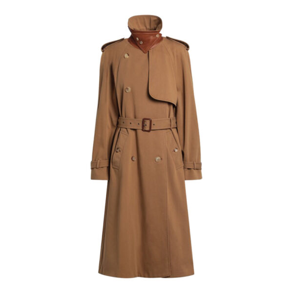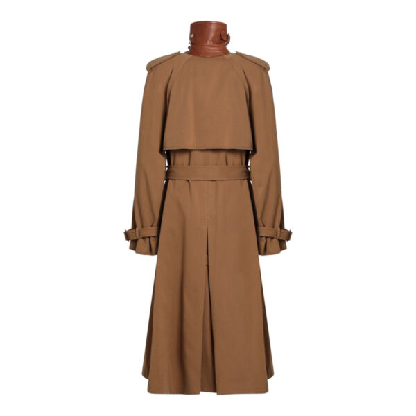 Beige water-repellent cotton gabardine long trench coat by Chloé, featuring a double-breasted front button closure, leather strap collar, adjustable and removable belt, two front flap pockets with button, long sleeves with adjustable cuffs, epaulettes on the shoulders, and a fluid fit.