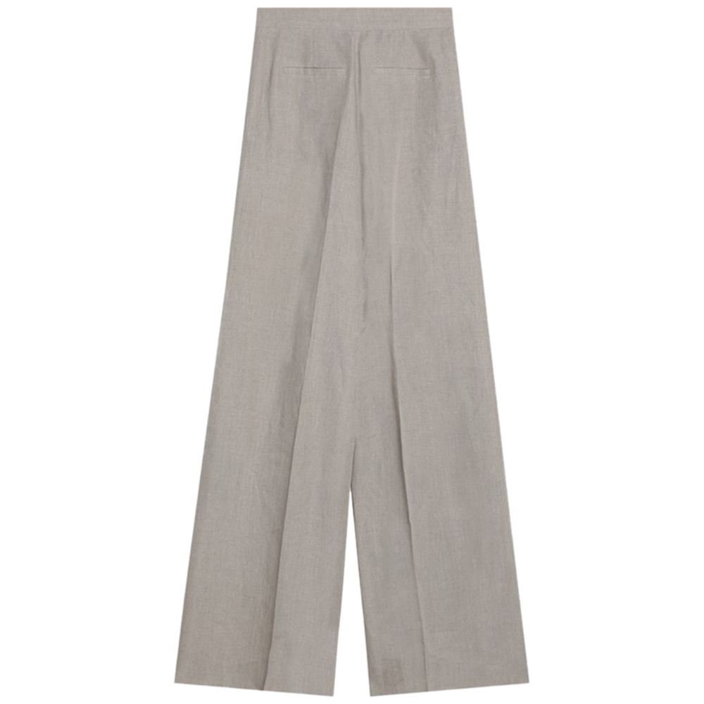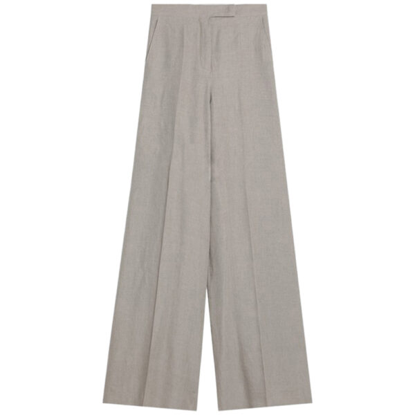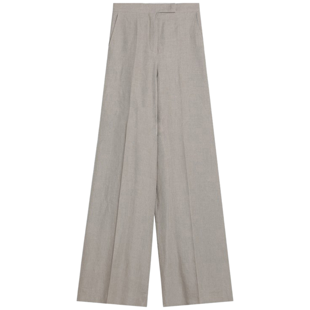 Wide trousers by Max Mara in beige linen fabric, characterized by a wide leg, high waist, pressed crease, side welt pockets, back welt pockets, and closure with a waistband, zip with flap, and hook.