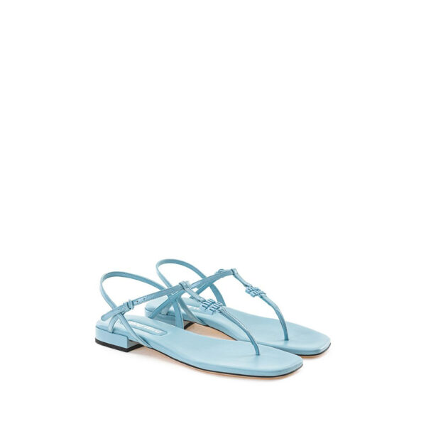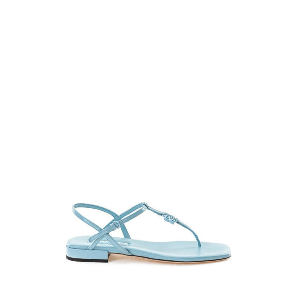 Miu Miu Azure Patent Leather Thong Sandal. Square toe, fully open front, T-Style and logo lettering on front. Thin leather outer sole and contrasting under heel in black. Composition: 100% Leather-Sku inside:24GIU41