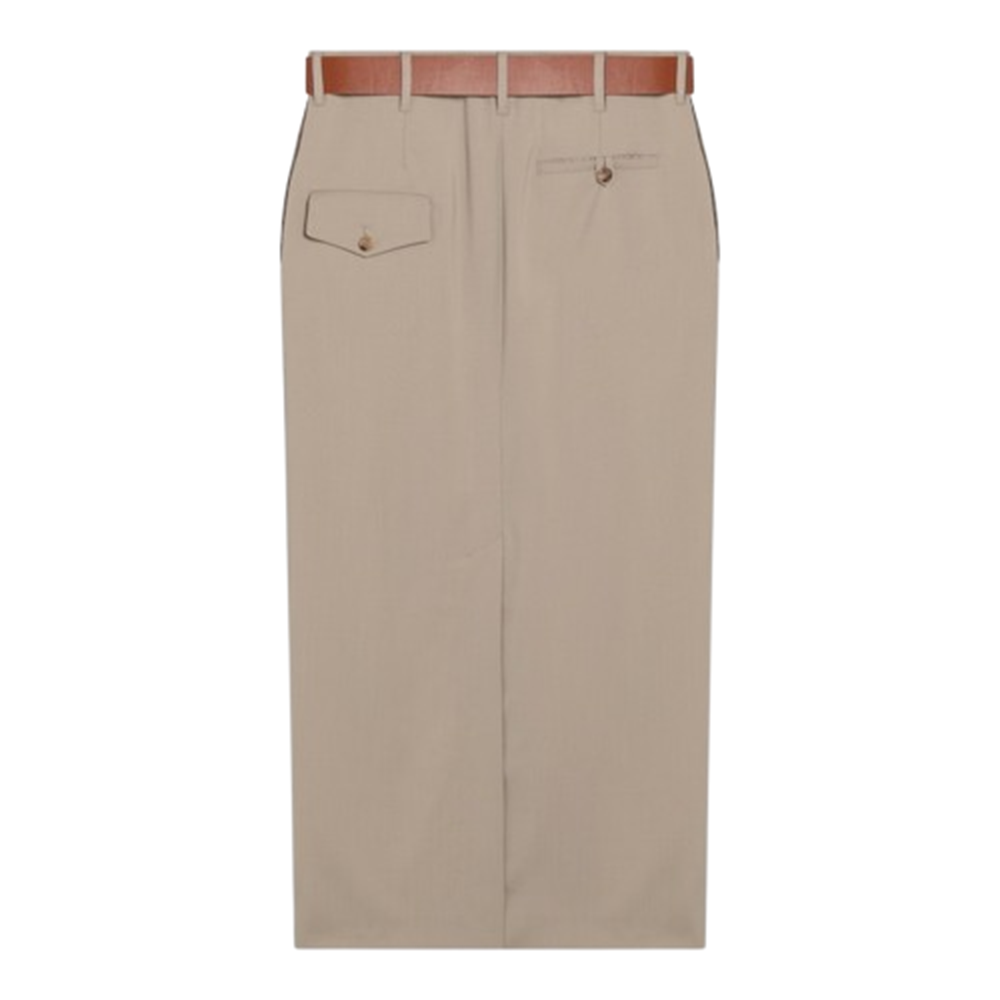Beige virgin wool midi skirt by Moschino, characterized by an adjustable and removable belt, belt loops at the waist, two side welt pockets, side buttons, a back slit, one flap pocket with button, and one welt pocket with button at the back.