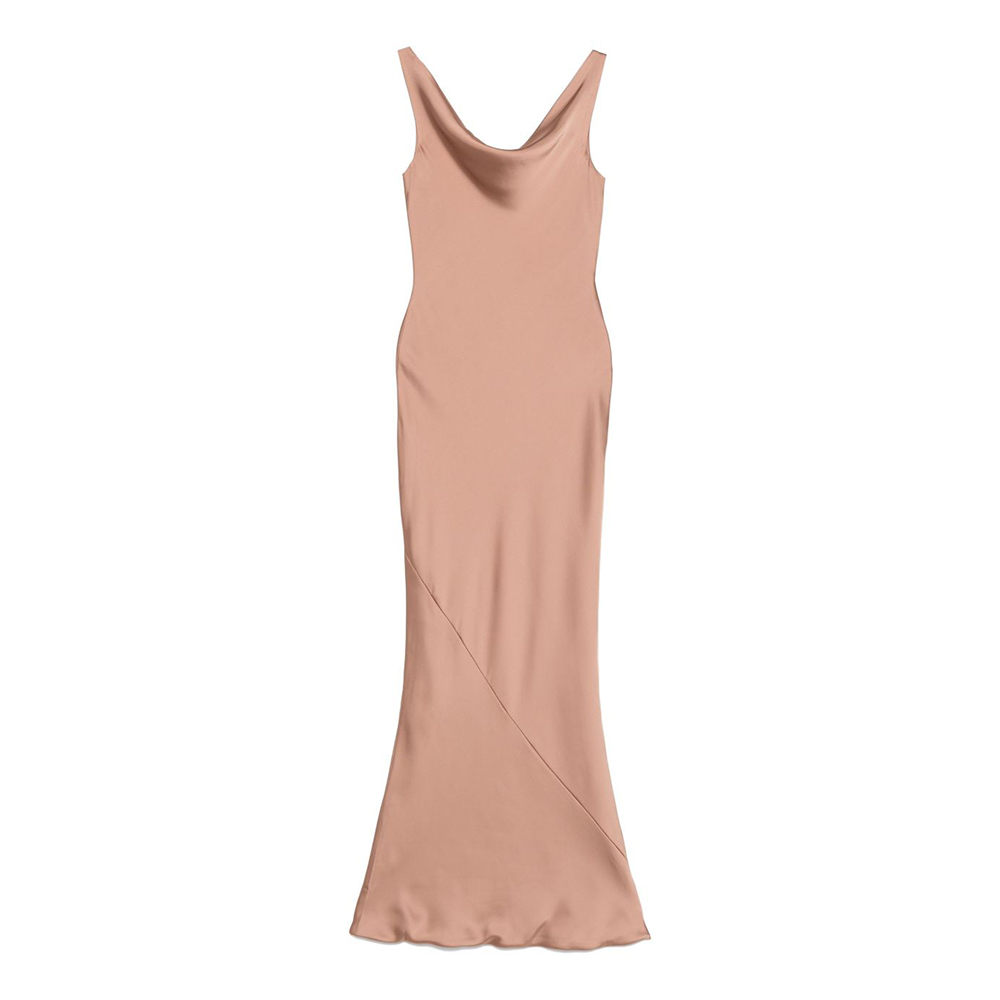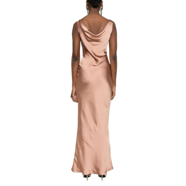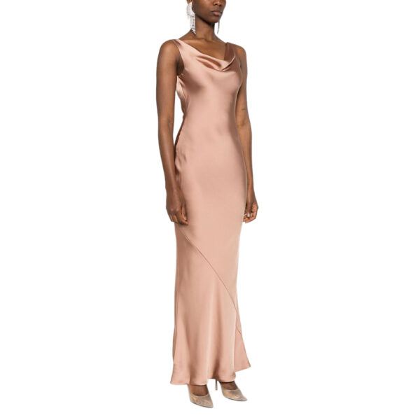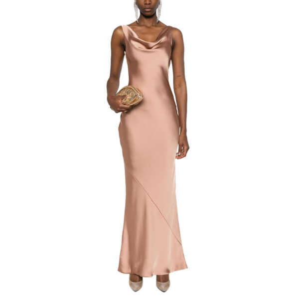 Golden brown cowl neck sleeveless full lining flared hem slip dress Maria gown