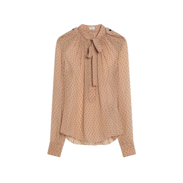 Beige silk blend blouse by Saint Laurent with small black polka dots, featuring long sleeves with buttoned cuffs, epaulettes on the shoulders, a neckline with front and back pleating, and a bow at the neck.