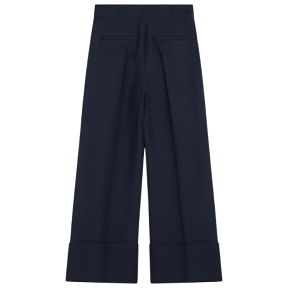 Valentino pants in virgin wool and indigo silk, characterized by a high waist, front zip closure with hook, two side welt pockets, two back welt pockets, front pleats, and a wide cuff at the leg bottom.