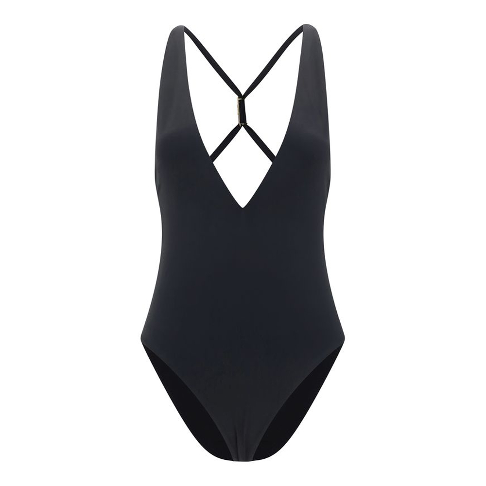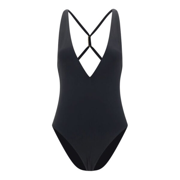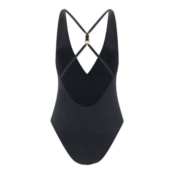 Versace’s Safety Pin One Piece Swimsuit is a bold and sophisticated piece with a V-neckline on the front that elegantly enhances the neckline. The iconic Medusa logo safety pin detail adds a distinctive and luxurious touch. Crisscross back straps complete the design with a modern and sensual effect, making this swimsuit perfect for those seeking a chic and iconic look at the beach.