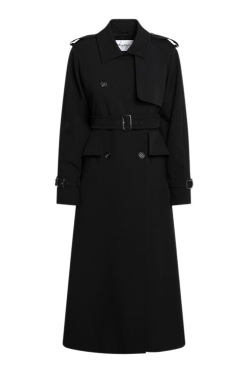Oversized trench coat by Max Mara Atelier in water-repellent gabardine made of brown wool blend, characterized by a wide back vent, front flaps, long sleeves with toggles, two side welt pockets, leather details, button closure, matching fabric and leather belt, and back slit.