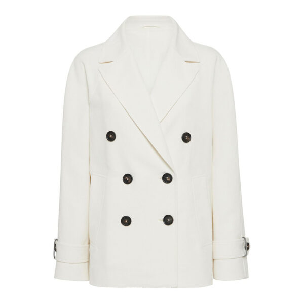 White double-breasted button fastening buttoned cuffs two side slit pockets Linen and cotton caban. LDL