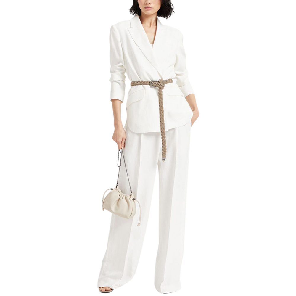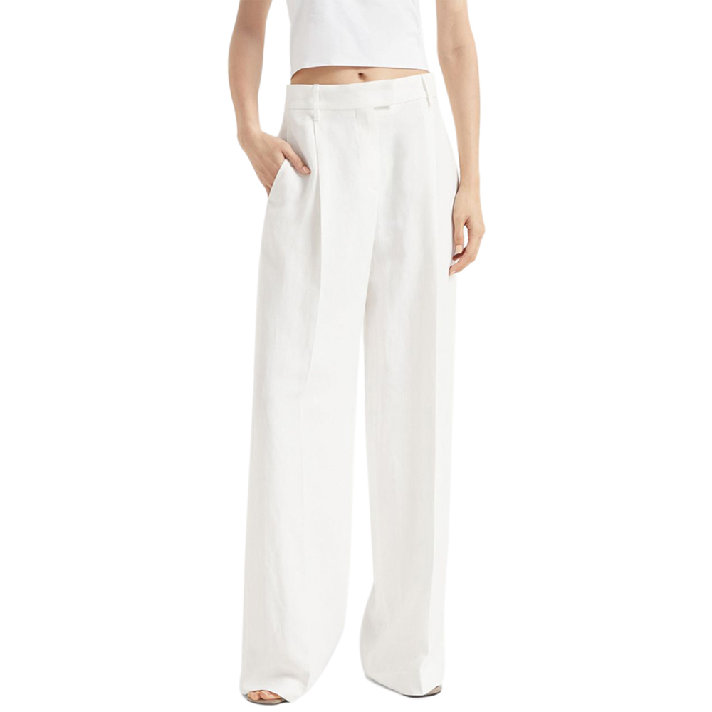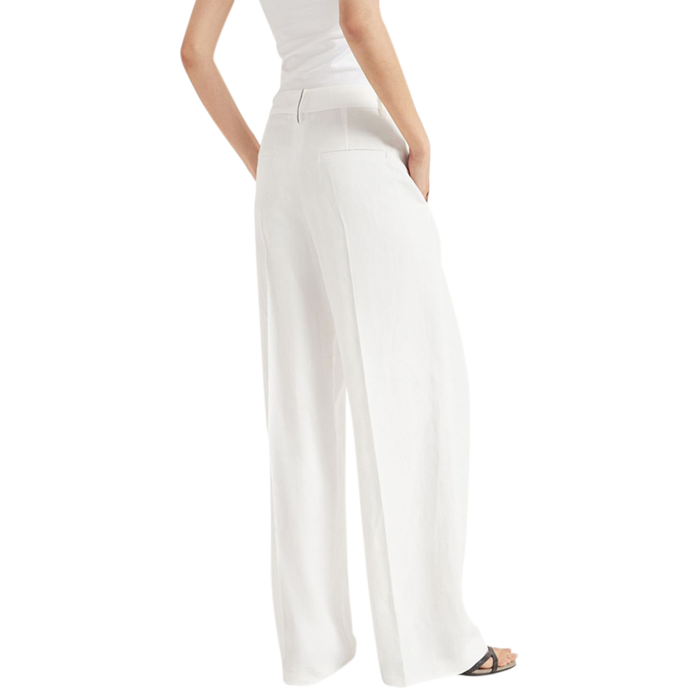 White concealed front button, hook and zip fastening belt loops two side slit pockets two rear welt pockets ampio morbido Linen trousers with shiny details