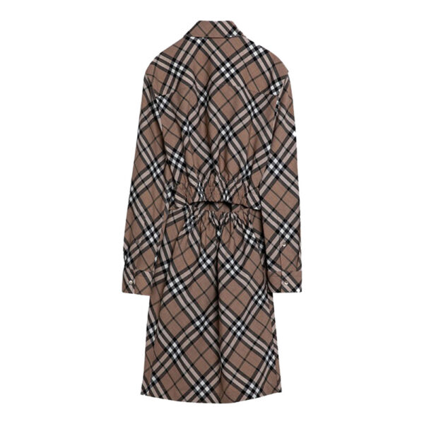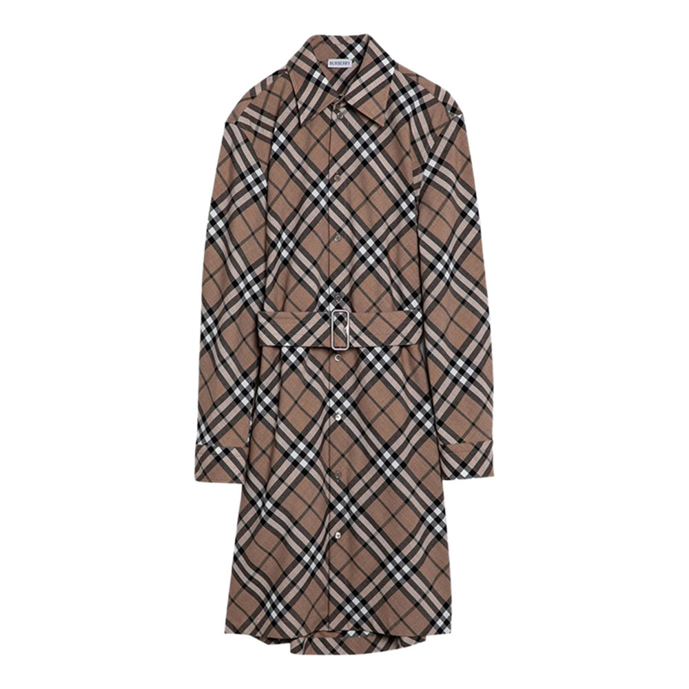Midi dress by Burberry in Check wool blend featuring classic collar, front button fastening, matching belt at the waist, long sleeves, button cuffs and a curved hem.
