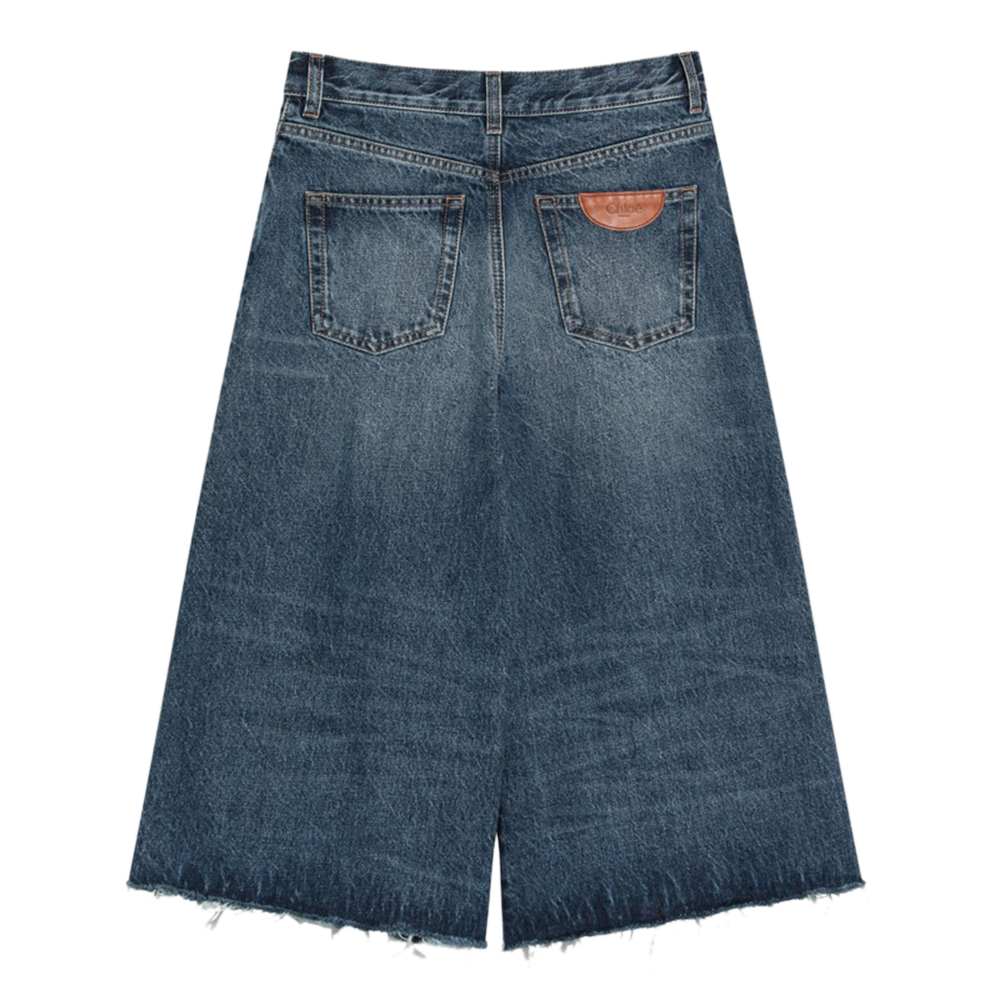 Chloé”s Bermuda shorts in Dark Night Blue cotton denim, featuring a high waist, knee-length, zip and button closure, five classic pockets, belt loops, a logo patch on the back, and a raw hem.