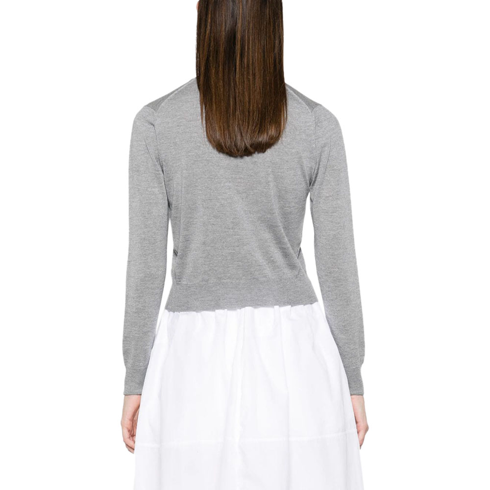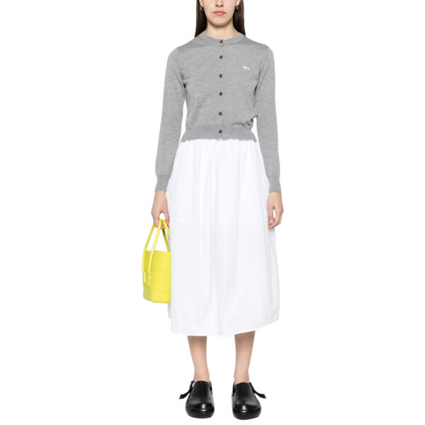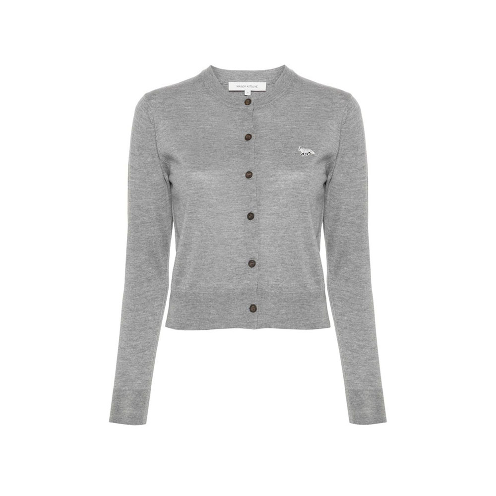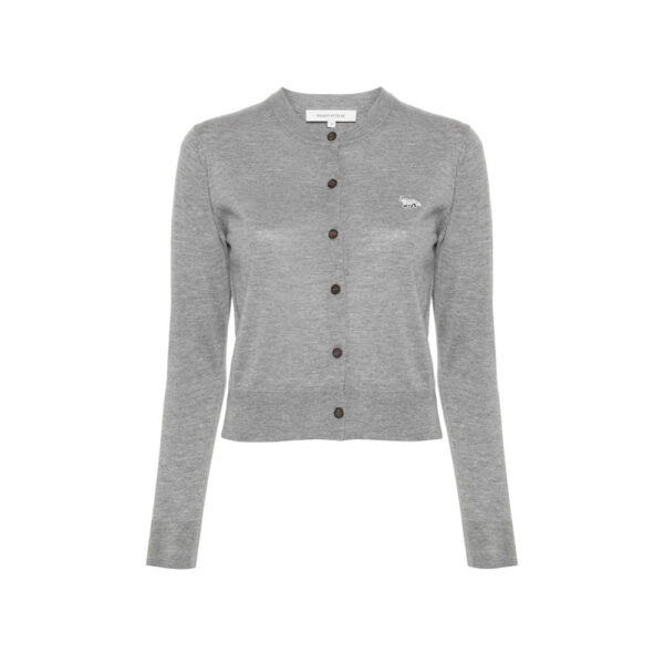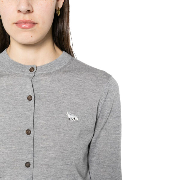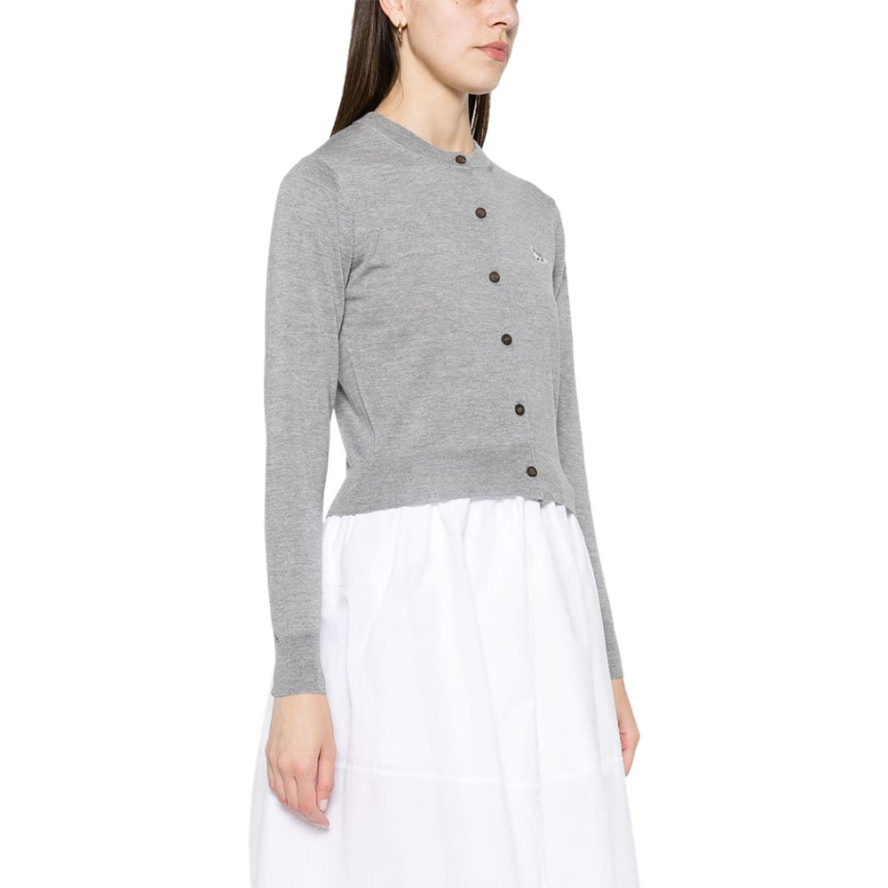 Grey wool fine knit tonal stitching embroidered logo at the chest round neck long sleeves ribbed cuffs and hem front button fastening. gcollo, corto Baby Fox wool cardigan