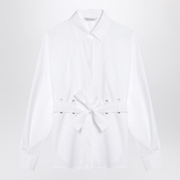 Max Mara shirt in white cotton poplin, characterized by waist loops with eyelets and matching belt, pointed collar, long sleeves with buttoned cuffs, rounded side slits, and hidden front closure with buttons.