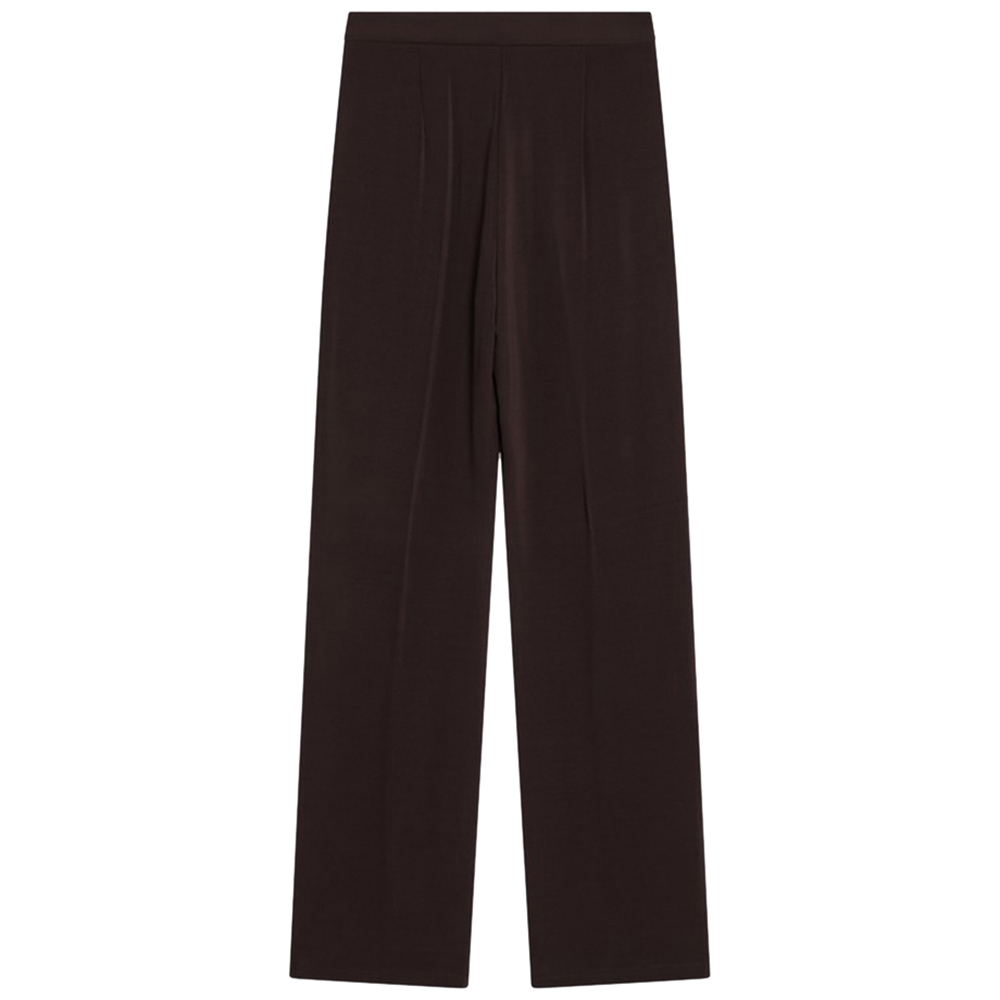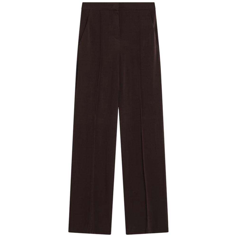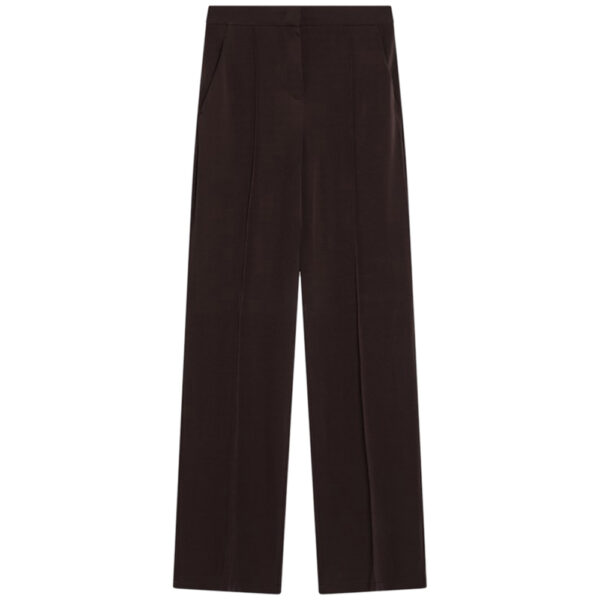 Max Mara coffee-coloured viscose pants, characterized by two side welt pockets and a front closure with zip, button, and hook.