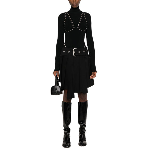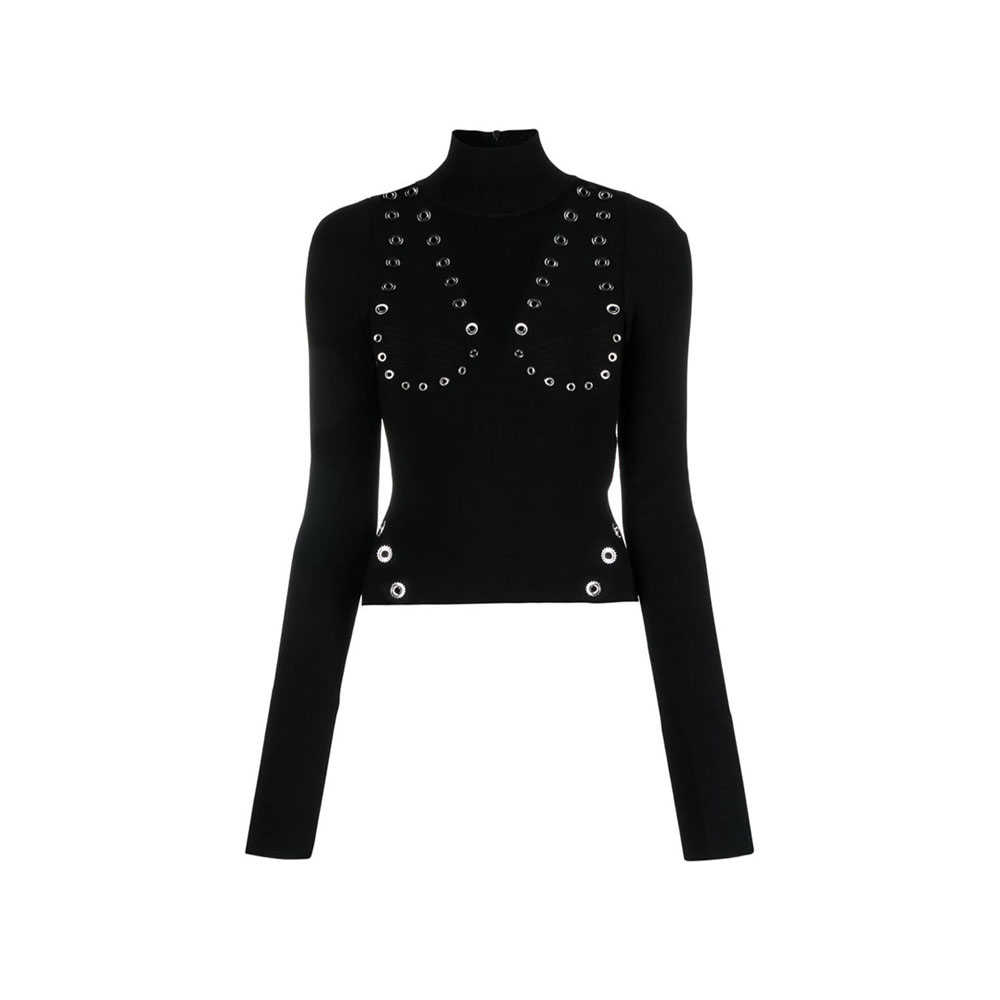 Eyelet-embellished knitted top from OFF-WHITE featuring black, knitted construction, eyelet embellishment, high neck, silver-tone hardware, long sleeves, short rear zip fastening and straight hem. c.alto High neck viscose sweater