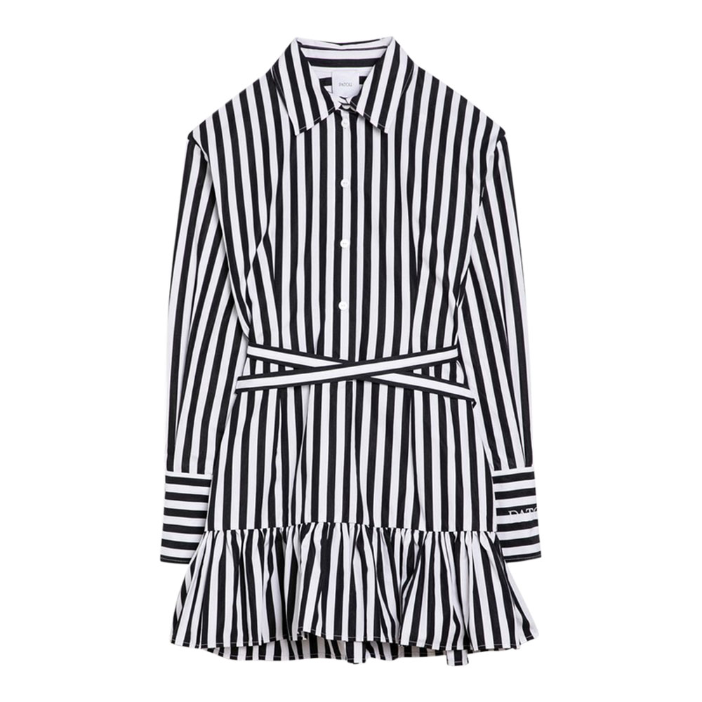 Black and white striped cotton mini chemisier dress by Patou featuring a classic collar, front button placket, long sleeves with buttoned cuffs and lettering, waistband and flounce at hem.