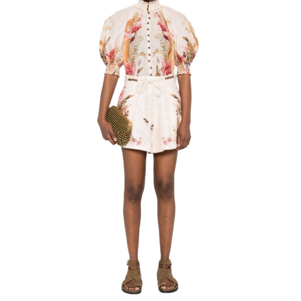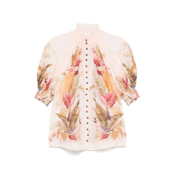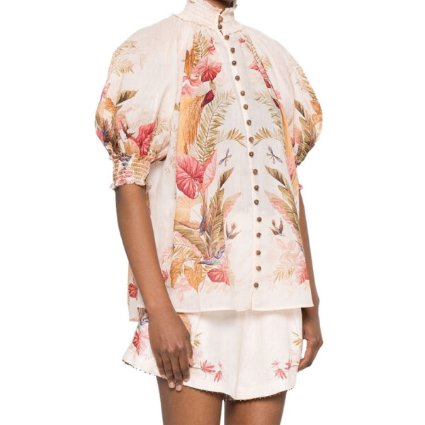 Light pink front button fastening high neck short sleeves m/c, c alto, abbottonata Ascension printed blouse