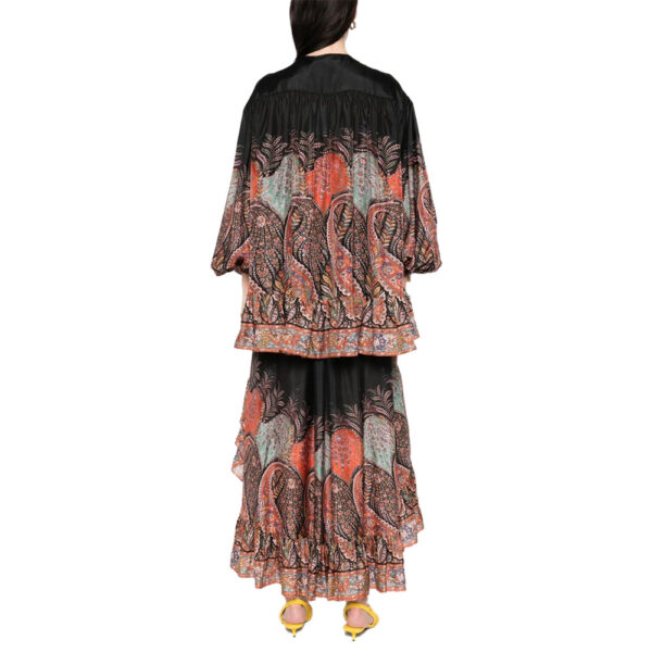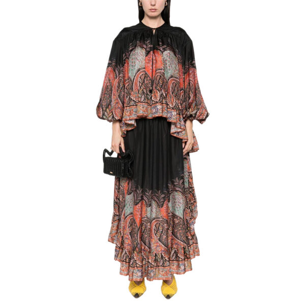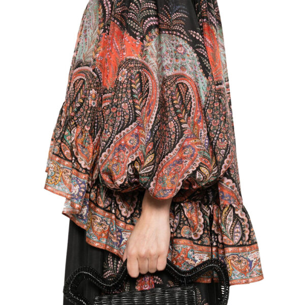 Black self-tie fastening elasticated cuffs ruffle hem paisley print blusa balze Rhiannon printed silk blouse