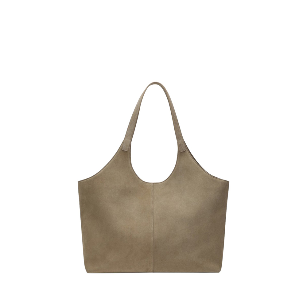 Aesther Ekme”s sand-coloured suede tote bag, characterized by two handles, magnetic button closure, internal laces, and an internal flat pocket.