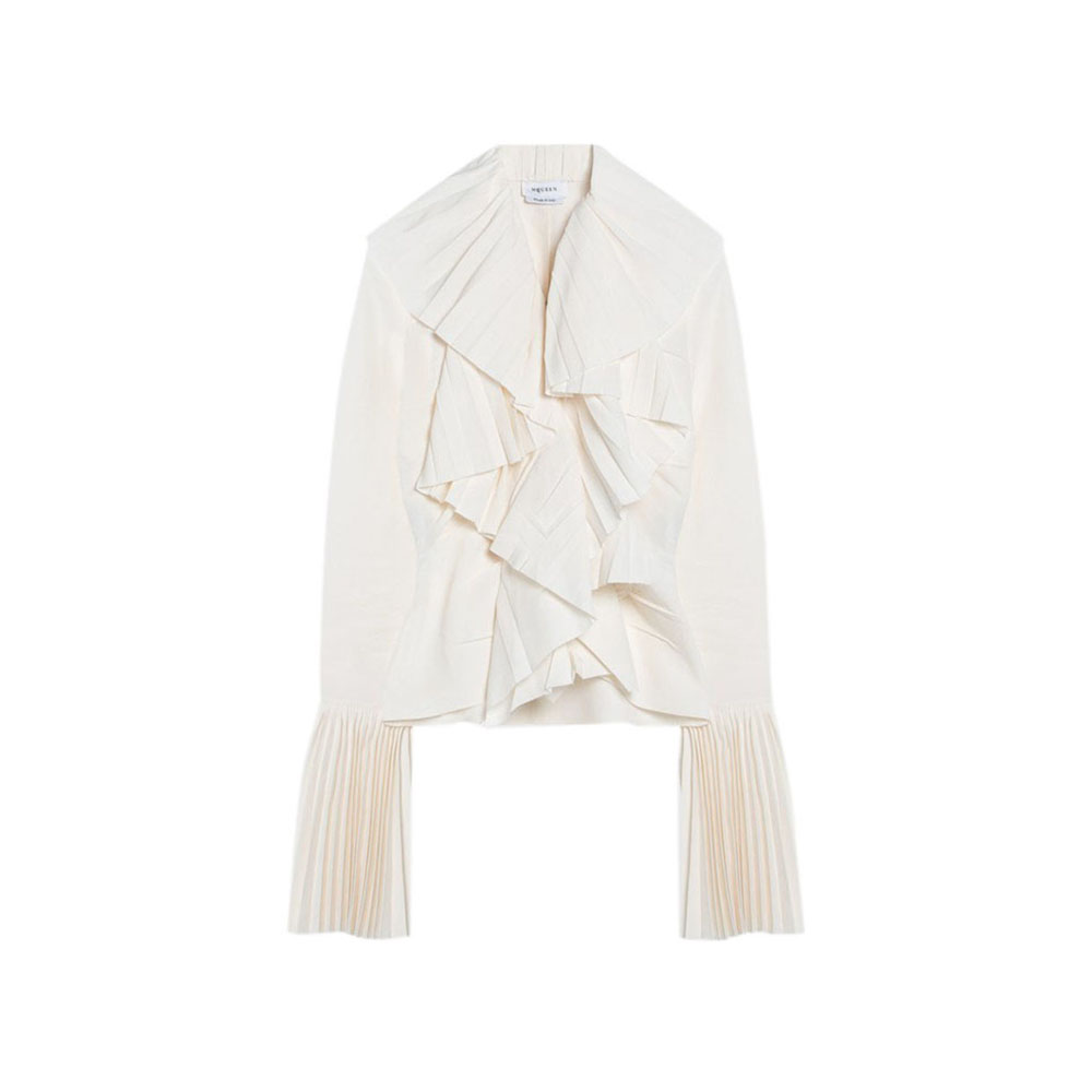 Ivory cellulose viscose blouse by Alexander McQueen, featuring pleated details, long sleeves with buttoned cuffs, and a V-neck.