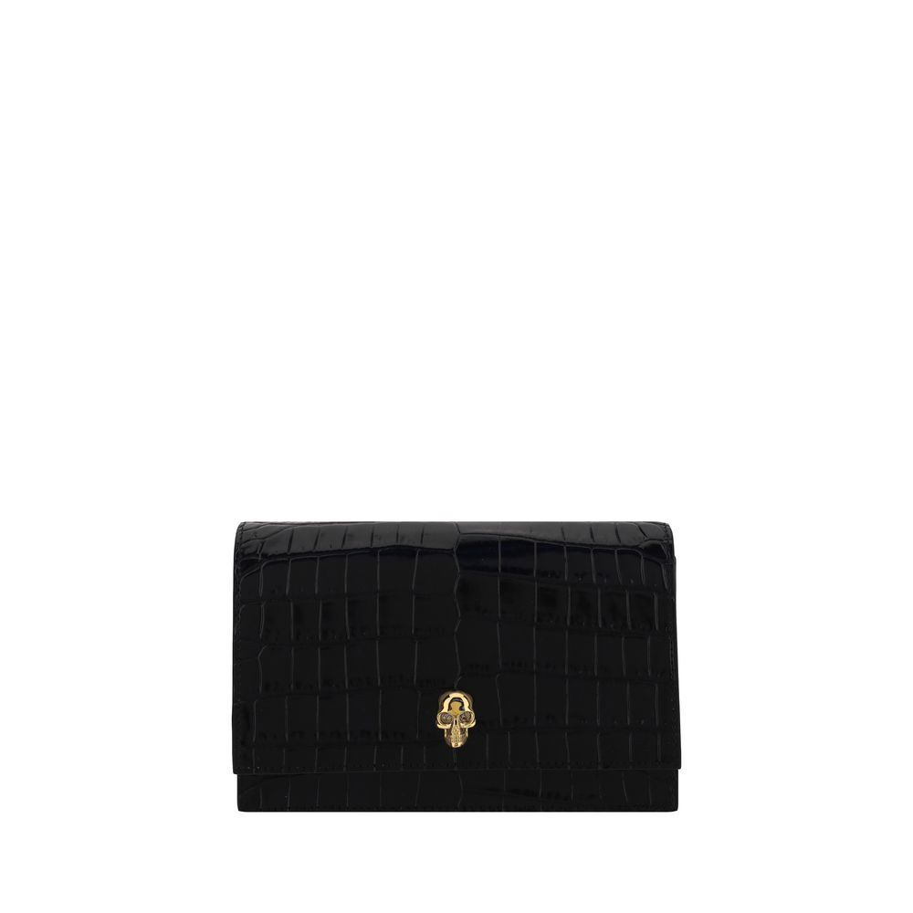 The Alexander McQueen Skull mini leather Shoulder Bag is crafted from patent crocodile-effect leather for a luxurious and distinctive look. Featuring a chain shoulder strap, it has a magnetic closure on the front for practicality and security. The iconic skull plaque on the front and contrasting brand signature on the back add character and recognition. Inside, a slip pocket offers organized storage for small essentials.