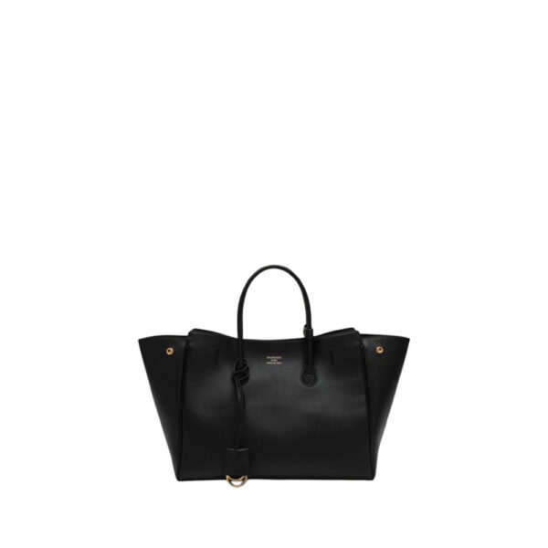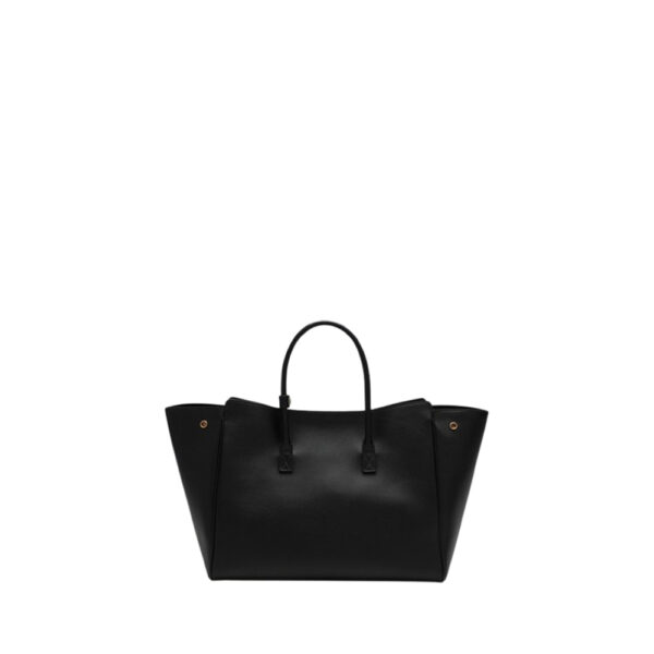 Black calfskin Balenciaga handbag, featuring two leather handles, an adjustable and removable shoulder strap, embossed logo on the front, removable keychain with double spiral ring, snap buttons on the sides, magnetic closure, one internal zip pocket, two flat internal pockets, and four brass feet.