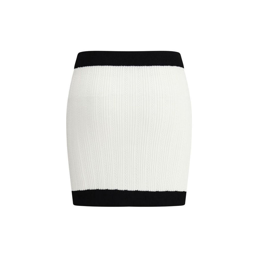 Balmain’s mini Skirt enhances the silhouette with a refined ribbed knit. Decorative gold metal “Coin” buttons at the front add an iconic and distinctive touch, while contrasting ribbed trim completes the design with character and sophistication.
