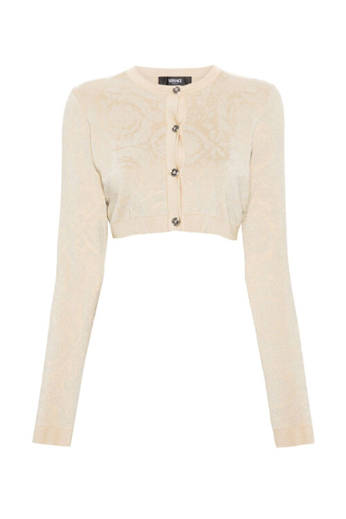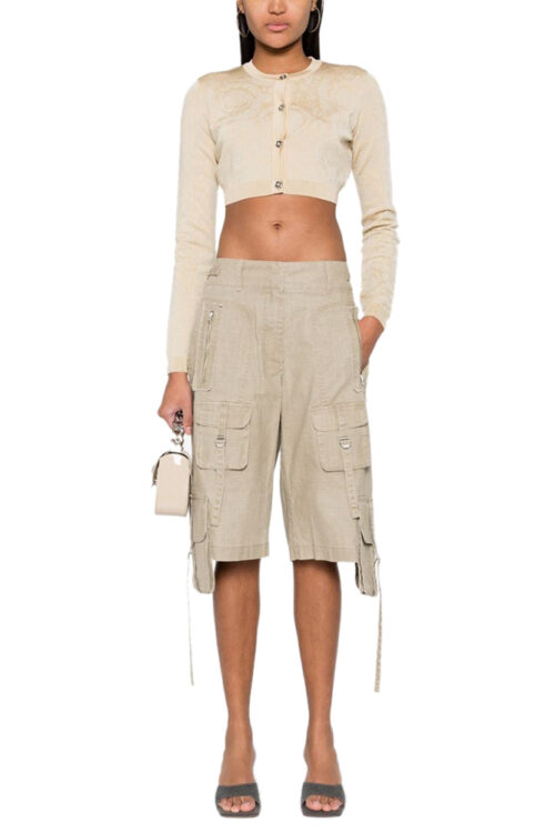 Black crochet knit floral pattern openwork areas picot trim sweetheart neck long sleeves logo-buckle detail cropped unlined gold-tone hardware front buckle fastening tubino, cut-out, butterfly Embroidered cropped cardigan