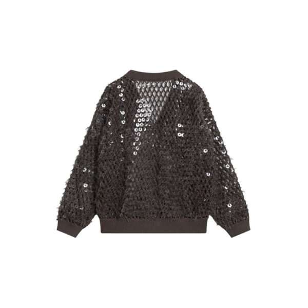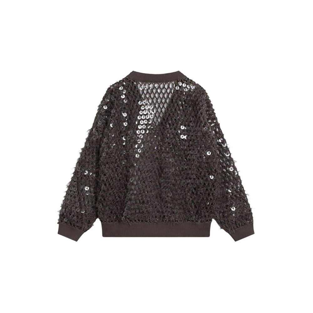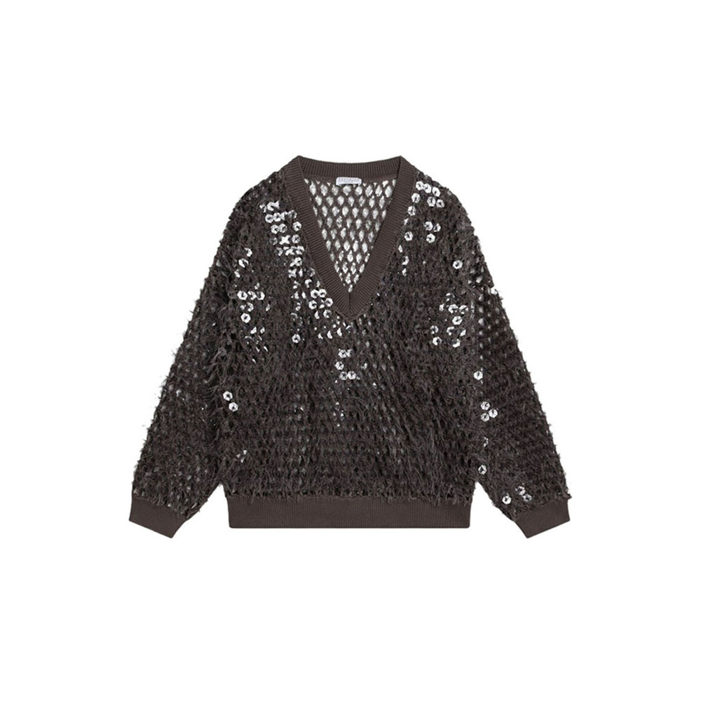 Brunello Cucinelli chocolate brown cotton sweater, featuring a V-neck, wide long sleeves, a net design with all-over sequins, and ribbed edges.