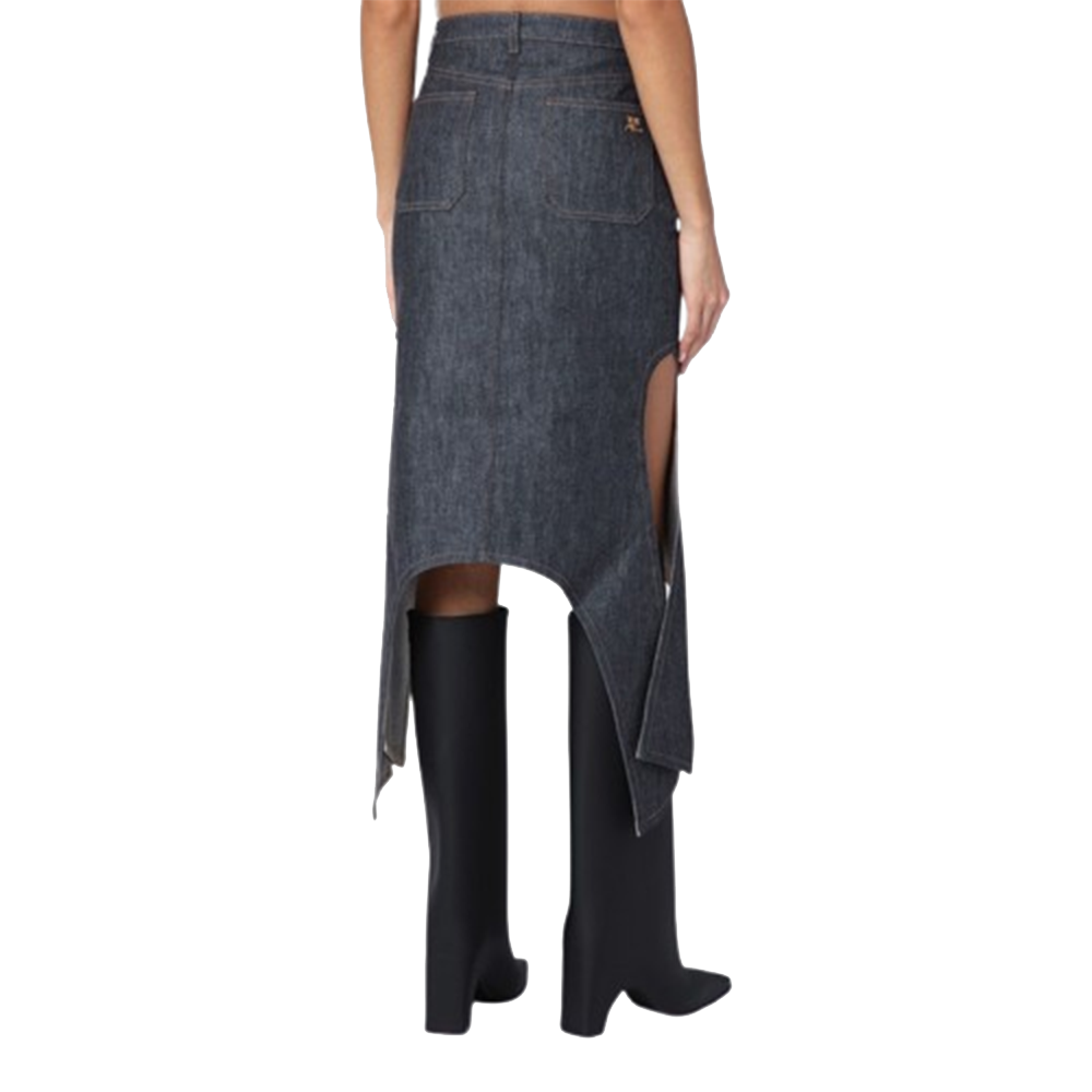 Dark grey cotton denim skirt from Courrèges featuring front zip and button fastening, waist loops, contrast stitching, five classic pockets with logo embroidery on the back, asymmetrical hem, inverted design, buttons on the front and small front logo patch.