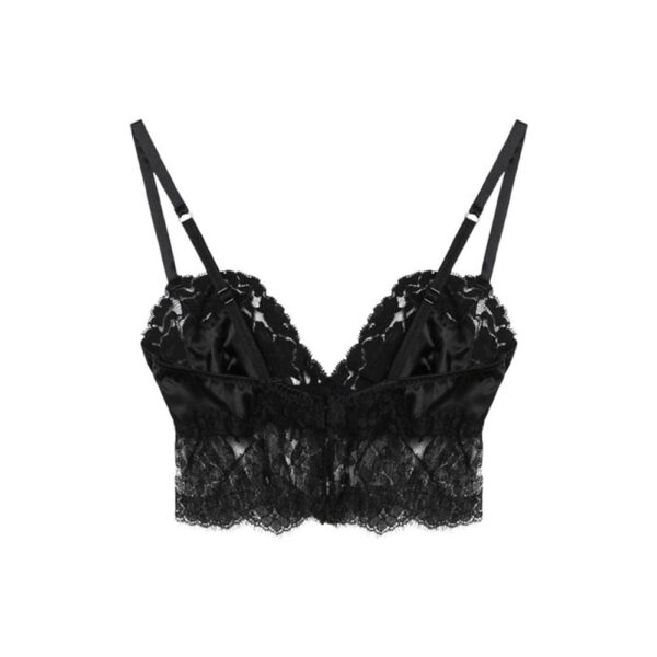Top bralette by Dolce & Gabbana in black silk satin, featuring lace edges, soft cups without underwire, thin adjustable straps, and a back closure with an adjustable hook.