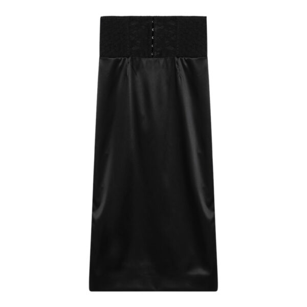 Black silk stretch satin longuette skirt from Dolce & Gabbana featuring corset belt detail, high waist and back zip and hook fastening.