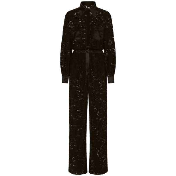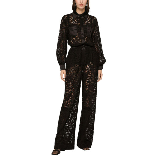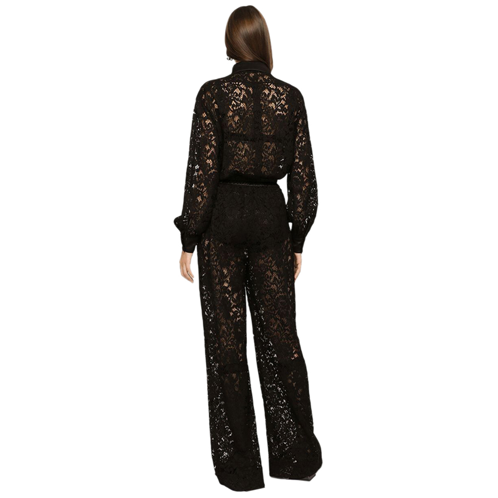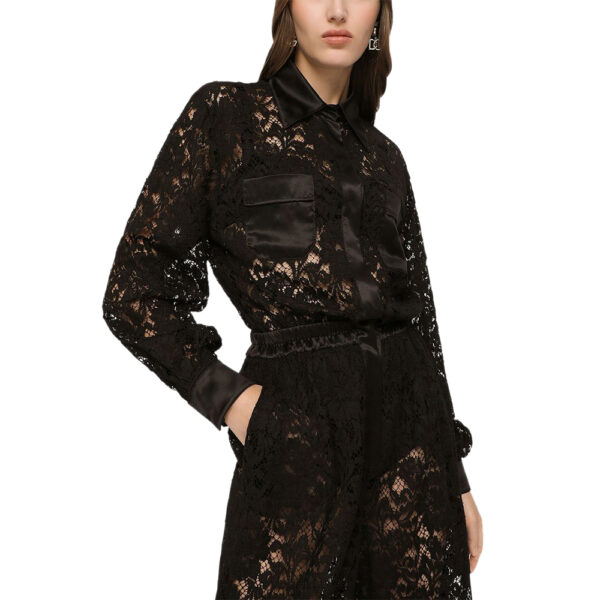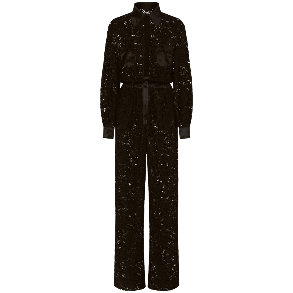 Lace-trim long-sleeve jumpsuit from DOLCE & GABBANA featuring jet black, silk-cotton blend, lace trim, semi-sheer construction, classic collar, concealed front button fastening, long sleeves, buttoned cuffs, elasticated waistband, two chest patch pockets and straight leg. a camicia, tutto pizzo Lace long shirt jumpsuit