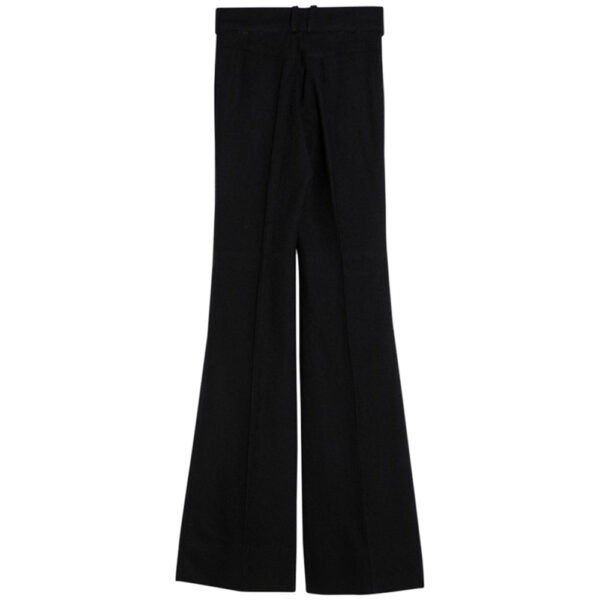 Black virgin wool and cotton blend bell-bottom trousers by Patou, feature a high rise, front zip and gold button fastening, belt loops and two side welt pockets.