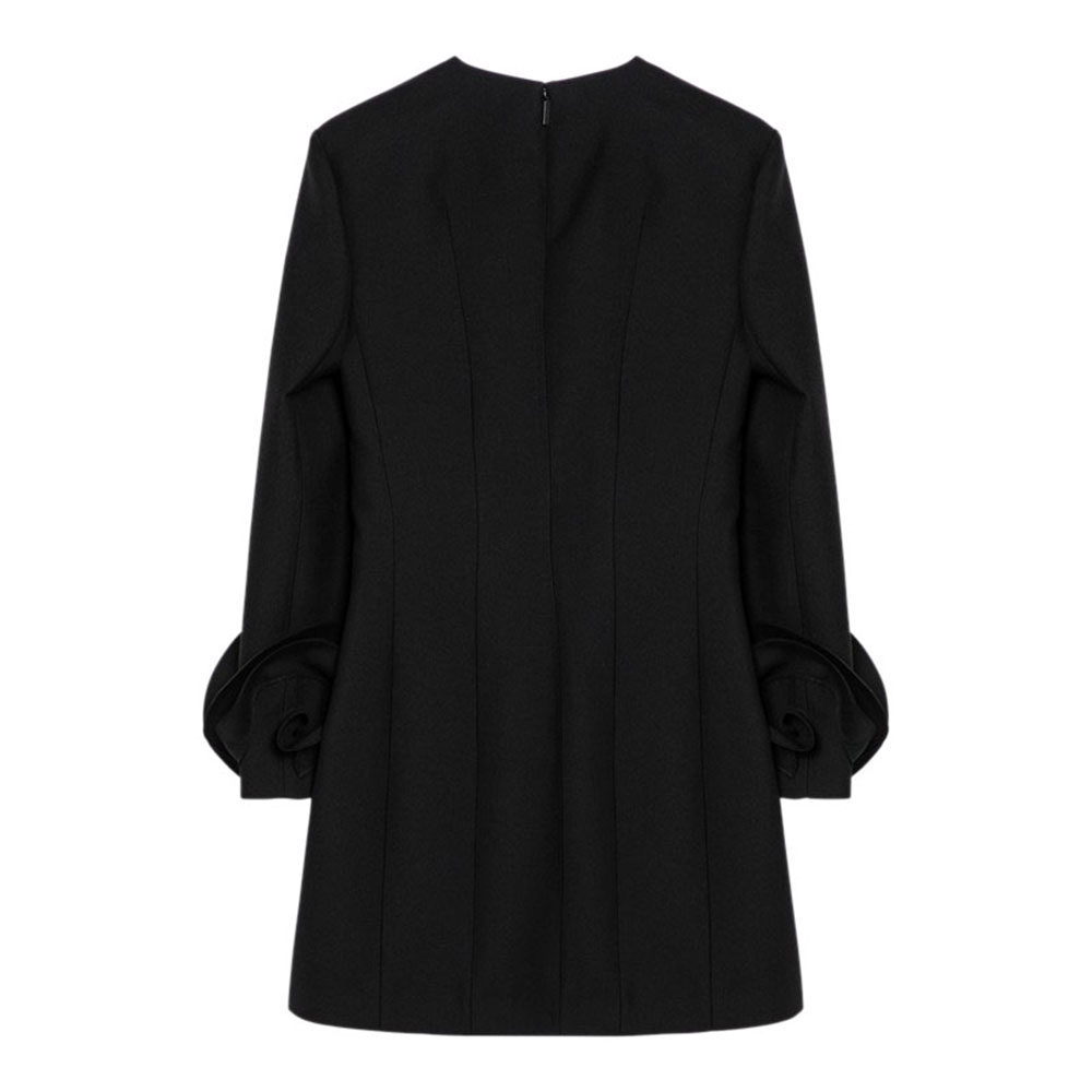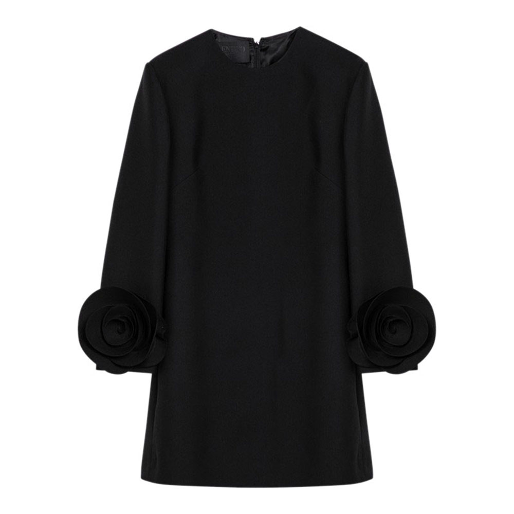 This short Valentino dress is made of Double Compact Drill virgin wool with rose appliques on the cuffs. It features a fitted silhouette with a slightly flared hem, round neckline, padded shoulders, and pockets inserted in the hips. Invisible zip closure at the back, lined interior.